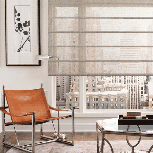 Architectural Roller Shades offer a design-forward approach. The rolling fabrics disappear into the headrail without exposing cords. It's a clean look with a stunning finish. The Hunter Douglas Kickback™ feature can be added to provide light control & privacy, positioning itself closer to the glass once lowered. It's a stunning option you have to see!